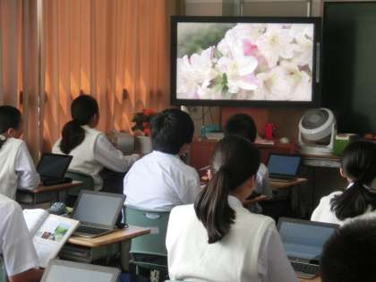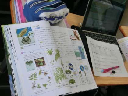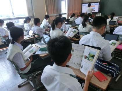 ※1年生、植物の分類をタブレットパソコンで実施。デジタル教科書など、写真や映像を駆使してかなりの難問のチャレンジ。問題解決型授業ですね。頑張ってください。指導は、理科の羽根田先生です。