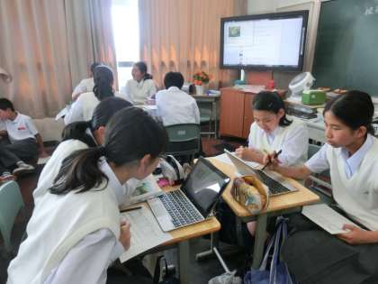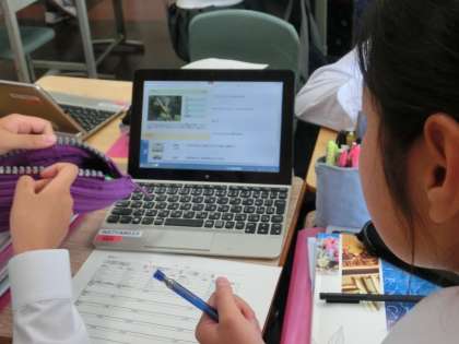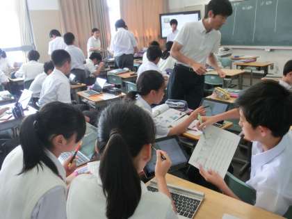 ※1年生、植物の分類をタブレットパソコンで実施。デジタル教科書など、写真や映像を駆使してかなりの難問のチャレンジ。問題解決型授業ですね。頑張ってください。指導は、理科の羽根田先生です。