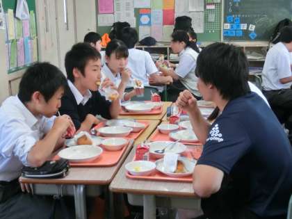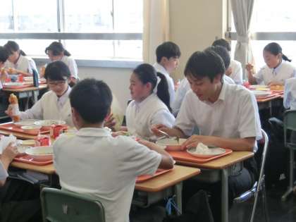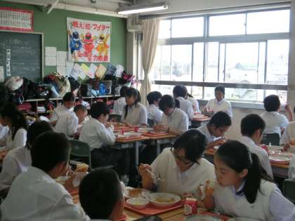 今日で最後の給食です。実習生の先生方は、班に入って談笑されていますね。