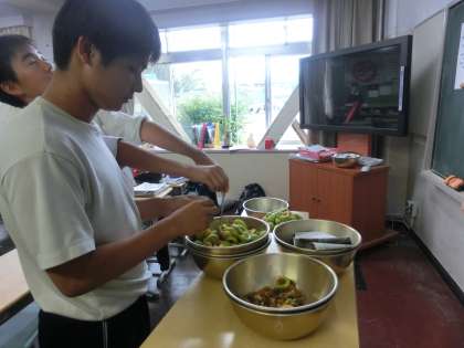 用務主事の石井さん等で収穫。給食委員の生徒さんと栄養士の橋爪さんが丁寧にタネを取り準備。調理の方々がケーキに入れて、焼き上げてくれました。甘酸っぱく、青春の香り?やはり皆さんの愛情たっぷりの調理が美味しさを演出してくれたのでしょう。