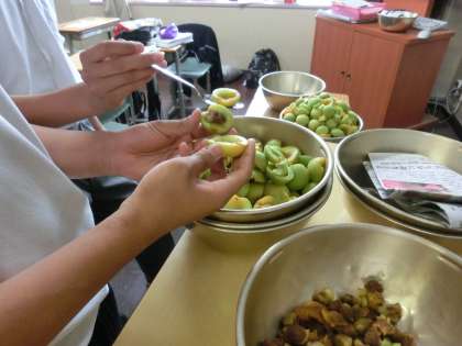 用務主事の石井さん等で収穫。給食委員の生徒さんと栄養士の橋爪さんが丁寧にタネを取り準備。調理の方々がケーキに入れて、焼き上げてくれました。甘酸っぱく、青春の香り?やはり皆さんの愛情たっぷりの調理が美味しさを演出してくれたのでしょう。