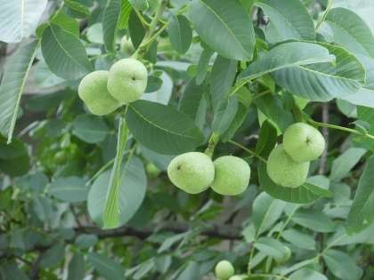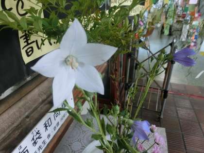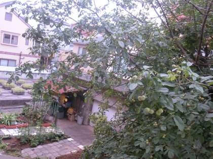 中庭の緑が青く眩しいですね。胡桃(くるみ)の大きな木がありますが、実が随分と大きくなっています。カブ、生け花の夏の花が輝いています。眺めてみてください。