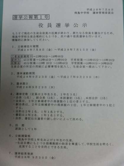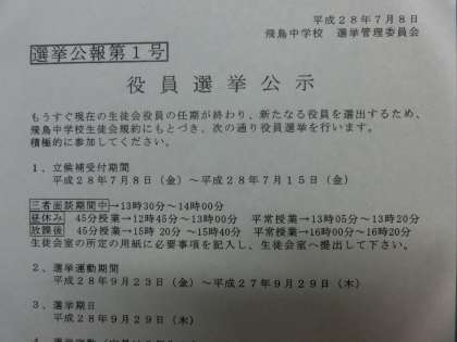 早いもので、次期生徒会役員選挙が9月29日(木)。新しい2年生が中心になって、伝統校飛鳥中を牽引(けんいん)していきます。