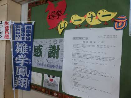 自分たちの選挙、生徒会役員選挙公示中です。正面玄関に現生徒会の皆さんが分かりやすく掲示してくれました。