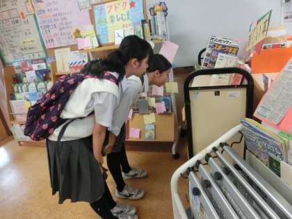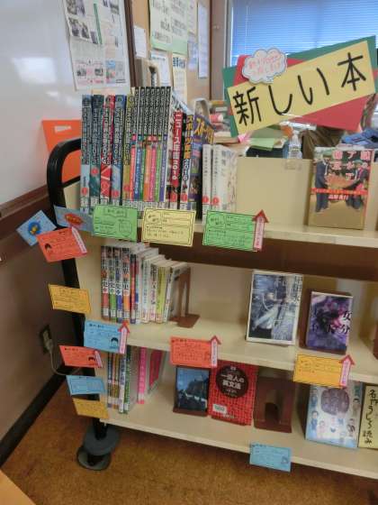 新刊本、テーマ別のコーナー、お薦め本など充実しています。学校司書の杉山さんがいつも相談にも応えていただいています。