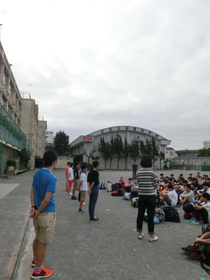 朝7時45分、実行委員会の司会で挨拶をし、出発です。1年生の生徒の皆さんは、小学校の移動教室で岩井海岸には行っていますが、臨海学校は初めての体験です。