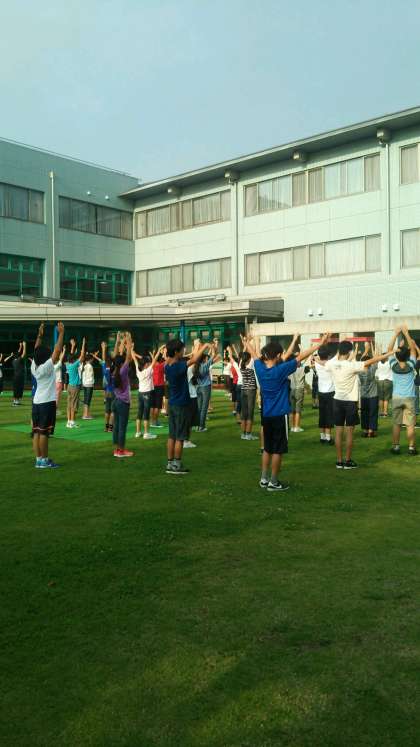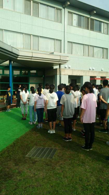 7月26日(火)1学年岩井臨海学園 2日目 元気に朝礼。生徒は全員、健康・安全です。