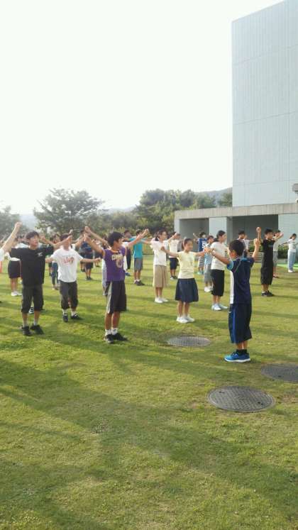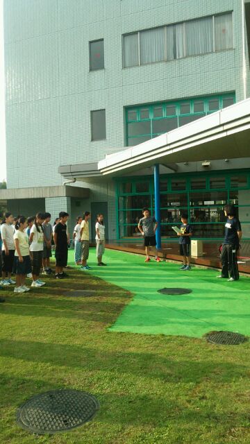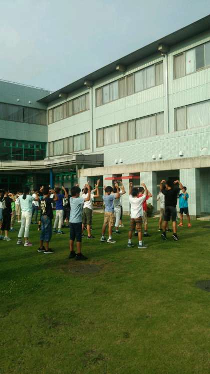 7月26日(火)1学年岩井臨海学園 2日目 元気に朝礼。生徒は全員、健康・安全です。