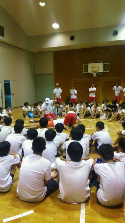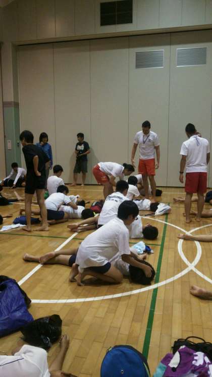 7月26日(火)1学年岩井臨海学園 2日目インストラクターの方々と生徒たちは、心肺蘇生の訓練です。本格的なものは初めてでしょうか。