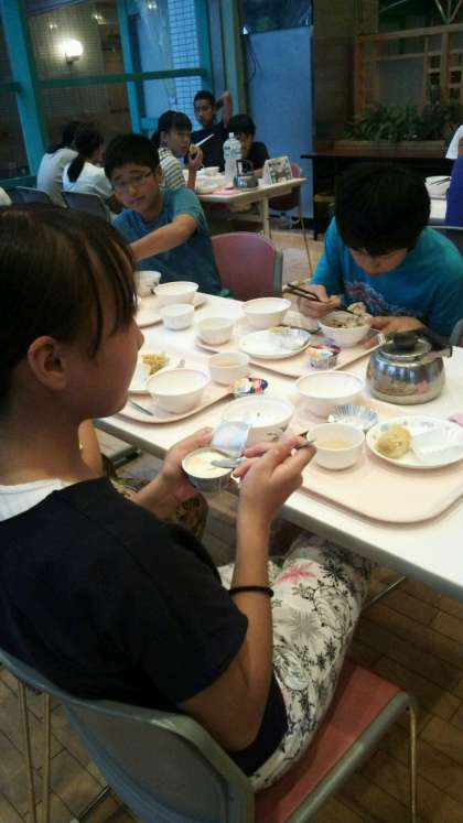 夕飯は、五目ちらし寿司、チキンソテートウモロコシ、のっペイ汁です。そして、バニラアイスクリームの登場に生徒は歓声をあげました。