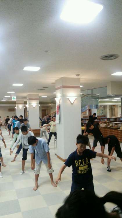 7月27日(水)1学年岩井臨海学園3日目おはようございます。岩井学園最終日です。朝礼は雨によりエントランスホールで行っています。