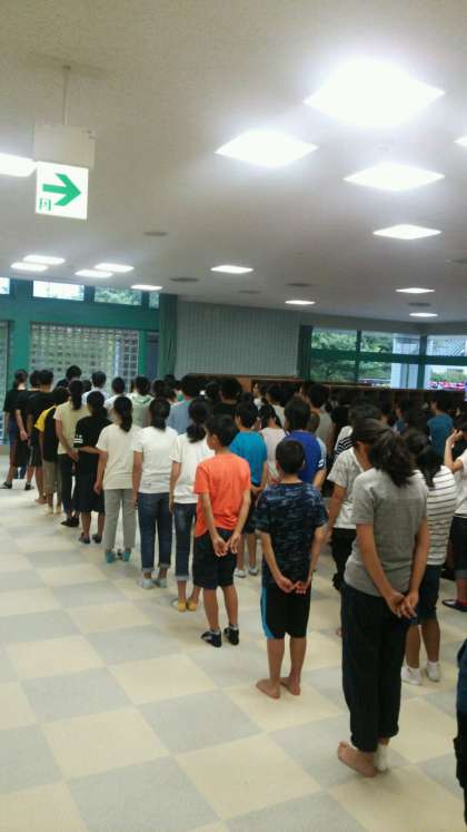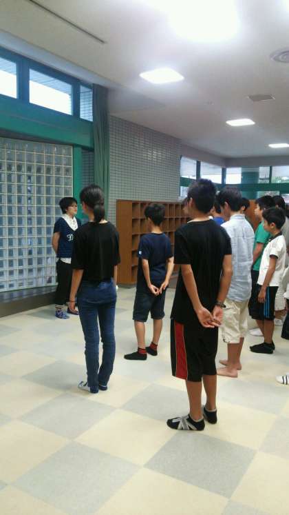 7月27日(水)1学年岩井臨海学園3日目おはようございます。岩井学園最終日です。朝礼は雨によりエントランスホールで行っています。