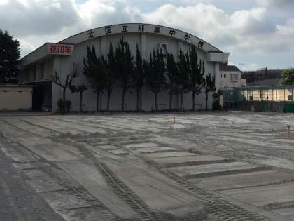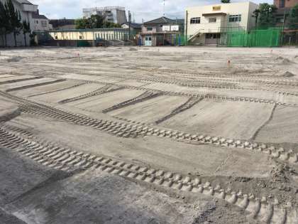 本校は、日本でも貴重な縄文貝塚遺跡の上にあるため、校庭のでこぼこをならす工事でも、教育委員会がしかるべき文化庁等に許可ももらう必要があります。ようやく3年かかりで整備許可が出て工事がは始まっています。約5センチ削り(何センチ削ってよいか許可が必要とのこと)、新しい最新の校庭用土を入れていきます。そして固めます。