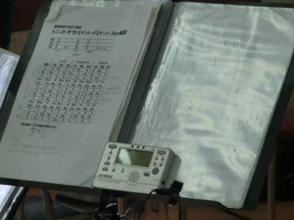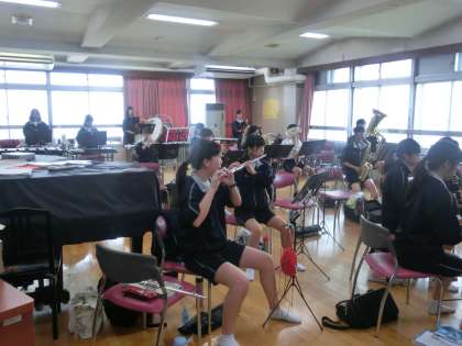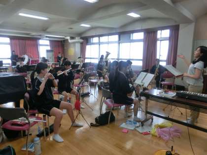 新しいデジタル機器も使って正確な音合わせにかなり時間をかけています。演奏よりも、音合わせに集中していますね。個人、パート別練習、全体練習、そして暑い体育館で特訓。正に、体育会系部活動ですね。(指導は音楽科三口先生)
