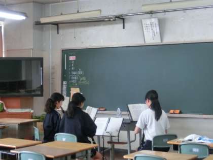 新しいデジタル機器も使って正確な音合わせにかなり時間をかけています。演奏よりも、音合わせに集中していますね。個人、パート別練習、全体練習、そして暑い体育館で特訓。正に、体育会系部活動ですね。歌も音合わせでしょうか?ペアで歌っていますね。(指導は音楽科三口先生)