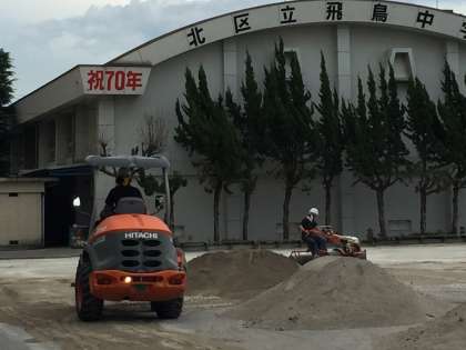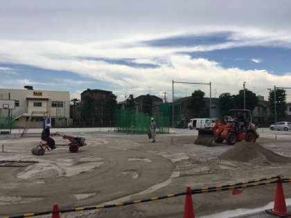 8月2日(火)暑中お見舞い申し上げます。校庭の新しい土が入って、地ならしが進んでいます。