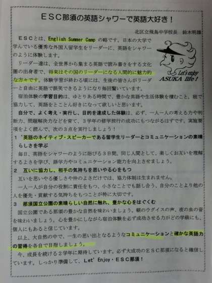 夏季休業日期間ですが、まもなくESC那須(English Summer Camp in 那須)です。8月11日(木)事前指導、8月12日(金)7時30分飛鳥中学校から出発します!