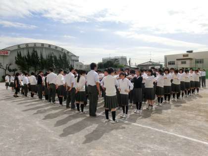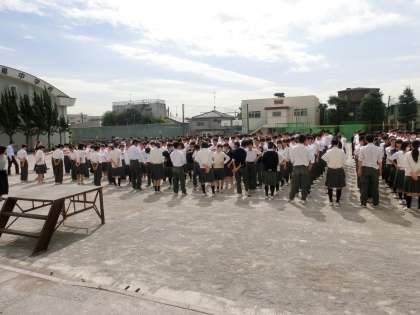 実は、スズメバチが校庭やプールを中心に出ています。今日は体育館にいることが分かり、校庭での終業式としました。かつて、1,000人以上生徒がいる時代はいつも、校庭で朝礼等も行っていました。