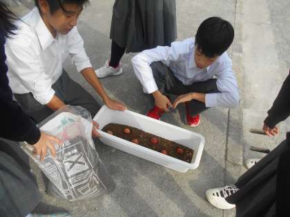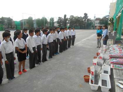 ガーデニングクラブのご指導で、来年度の入学式等で新入生をお迎えするチューリップの球根植えをこの時期に行っています。いつも、大輪の美しいチューリップが春に咲きます。これから秋・冬となりますが、いつもガーデニングクラブの皆様が学校のお花の手入れもして下さるので、いつも美しい花々が咲いています。本当にありがとうございます。1年生も心を込めて植えました。