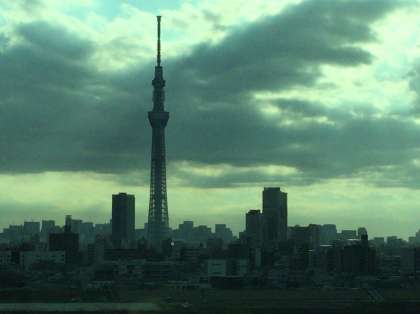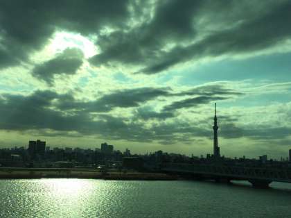 スカイツリーが夕陽に輝いています。まもなく学校に着きます。バス解散です。生徒の皆さん、健康・安全です。保護者の皆様、ご協力ありがとうございました。