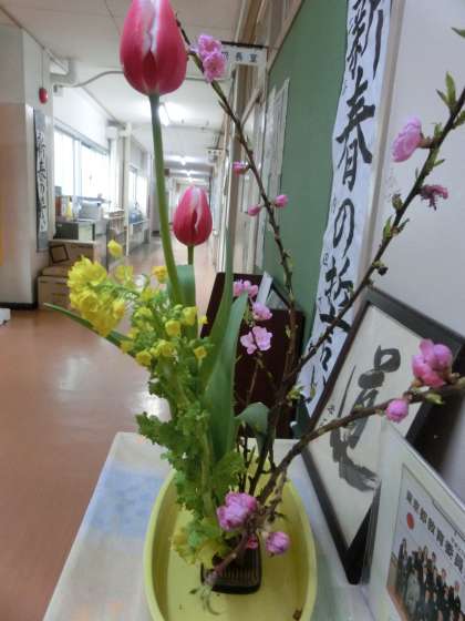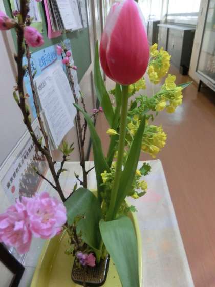 春が近づいています!学校の生け花には、梅・チューリップ・菜の花が登場。