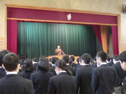 3月13日(月)3年生 最後の朝礼 立派な態度で有終の美を飾りました。いつも真剣に話を聞いていた3年生です。バイオリンと卓球の個人表彰を行いました。おめでとうございました。