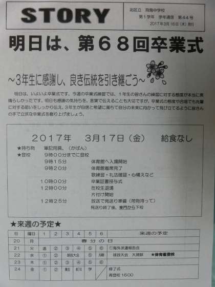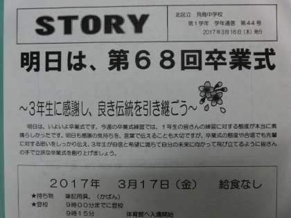 3月16日(木)明日は卒業式です。1・2年生も卒業生のためにいろいろと準備をしています。PTAの皆様もご準備ありがとうございます。