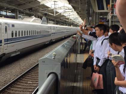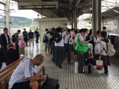 京都駅に生徒の皆さん、全員、健康・安全で集まりました。ありがとうございました。西の方へ向かう反対ホームの修学旅行の中学生団体を親しげに手を振り送っています。