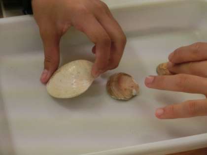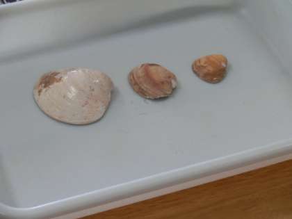 ※社会科の授業では、飛鳥山博物館学芸員さんにゲストティーチャーに来ていただき、縄文時代のアサリとチジミとハマグリの違いを手で触って確認していました。アサリには縦筋があることを初めて知りました。