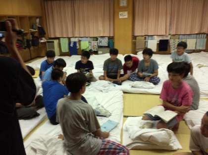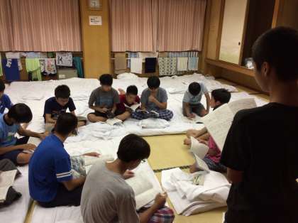 部屋会議。班長がきちんと明日の準備や朝の検温まで指示してますね。また班員もメモして確認しています。素晴らしい。