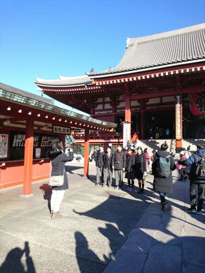 早くからものすごい数の人です。中学生も団体で、雷門の前で記念撮影です。外国の方も多い!英語で話し掛け、東京、日本のことを伝える課題があります。飛鳥中学校2年生頑張っています。