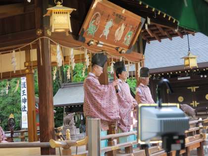 護王神社では、まず舞楽についての説明があり、各楽器の説明や実際の舞を披露していただきました。
