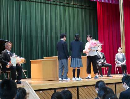 4月26日(金)の午後には、昨年度末に異動された先生方が離任式にお越しになりました。体育館で私の方から一人一人の先生の紹介をし、生徒からの感謝の言葉と花束が渡されました。