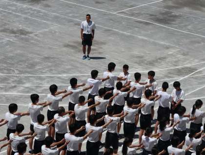 5月8日(水)は、朝から雲一つない天気となりました。3時間目には、1年生は英語、2年生は家庭科、3年生は初めての学年運動会練習を行っていました。入場行進や準備体操などを真剣に確認していました。