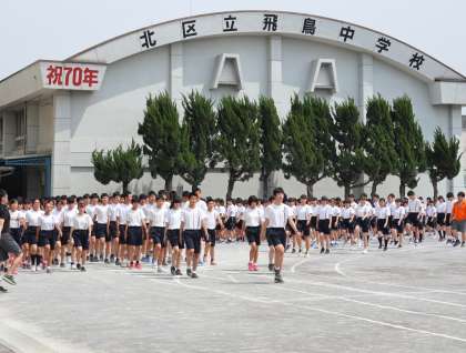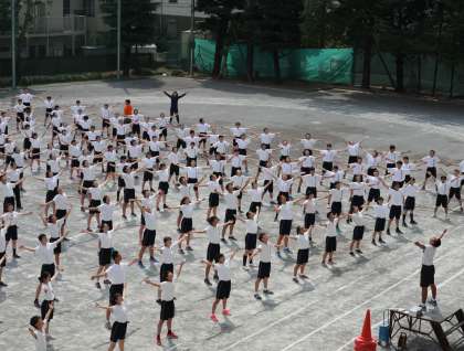 5月10日(金)の5時間目には、全校での運動会練習を行いました。整列の確認、入場行進、ラジオ体操などを一通り確認していきました。気温がかなり高い中、水分を十分に取りながら、短時間でしっかりした練習ができていました。
