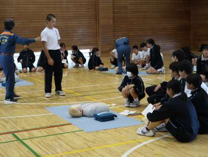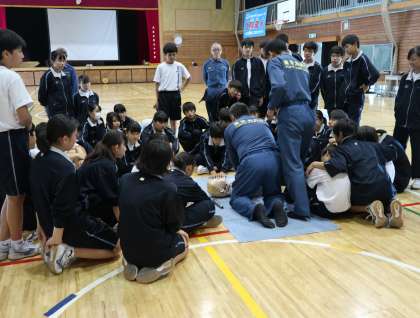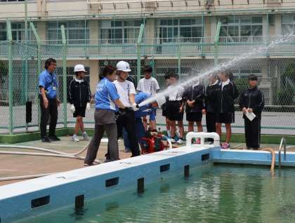 5月29日(水)の午前中、2年生は防災学校を実施しました。消防署や区の危機管理室の方に来ていただき、心肺蘇生訓練やD級ポンプの使用、ロープワークなどを体験しました。それぞれか真剣に取り組んでいました。