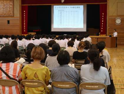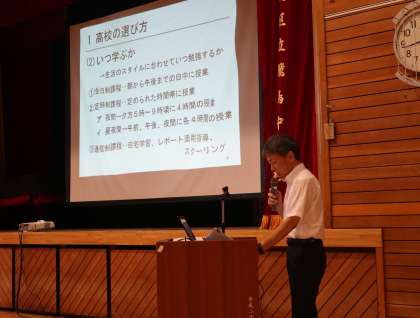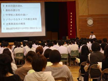 6月7日(金)の6時間目には、3年生は体育館で進路に関するお話を、本校と中高連携を行っている都立芝商業高校の校長先生から伺いました。高校の種類やその選び方の基本的な考え方などについて伺うことができました。最後に芝商卒業生が作成した芝商のPR動画を見ました。多くの保護者の方も参加されていました。