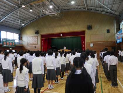 6月10日(月)は、朝から雨が降る天候となりました。梅雨らしい天気で気温も低くなっています。朝礼では、校歌を歌い、私の方から、中間考査に向けて、分散学習をして、能率的に学習をすすめていきましょうというお話をしました。あとは、各委員会からの連絡がありました。