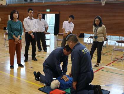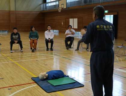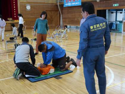 6月11日(火)の放課後には、滝野川消防署の方に来ていただき、先生方の救命講習会が実施されました。主に心臓マッサージとAEDの使い方の確認をして、実際に蘇生体験をしました。