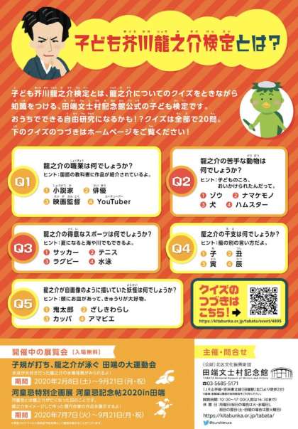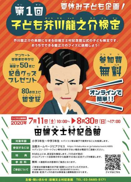 「 田端文士村記念館 」より、「第1回 子ども芥川龍之介検定 」の案内が届きました。