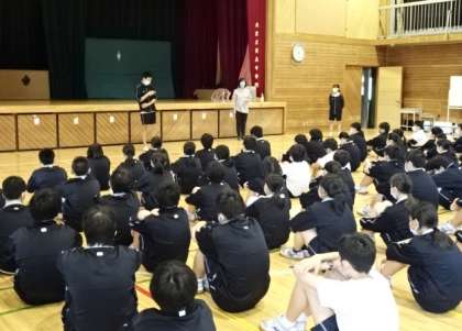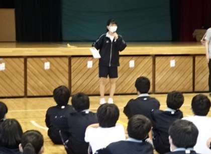 私が体育館を覗いたとき、学級委員長が、これまでを振り返り、各クラスの良かった点や夏休み後に始まる新しい環境での過ごし方について、学年の代表としての決意を述べていました。(写真:上)