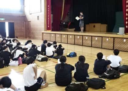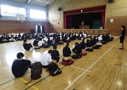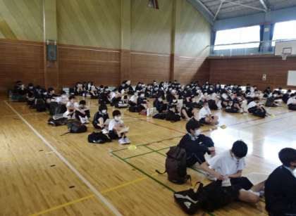 放課後、通学バスを利用する生徒157名が体育館に集まりました。