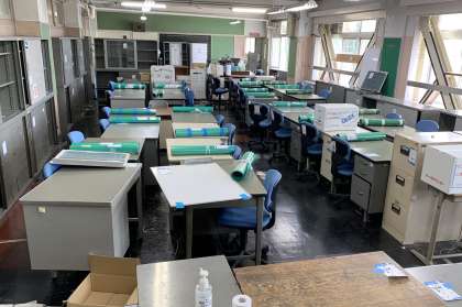 午後から仮校舎の職員室・校長室・事務室に机などが収められ、その後、パソコンや電話が設置されます。