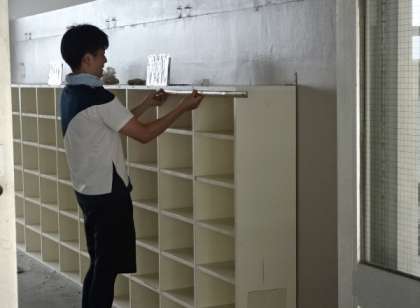 以前もお伝えしましたが、この下駄箱は、他校から譲り受けたものです。ご覧のとおり、暑い中、ものさしで測りながら1枚1枚丁寧に貼ってくれています。