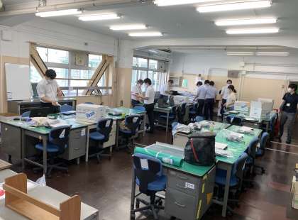 職員室の机が並べられ、パソコンの設置・設定作業が進められています。