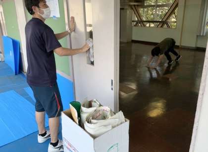 一通りの清掃作業はされているのですが、床が埃っぽかったり、扉がざらざらしているため、水拭きをしてくれています。暑い中、頭が下がります。感謝!