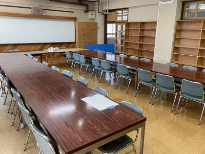 写真:下は、会議室です。副校長先生と「 明るくて、すごくきれいですね。」「 応接室がないので、会議室 兼 応接室ですね。」と。