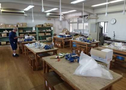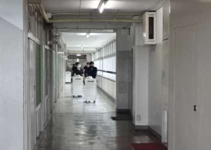 写真:中、隣の技術室でも担当の先生が、たくさんある段ボール箱を一つ一つ開封していました。技術室の段ボール箱も、1日でここまで片付くはずが・・・。