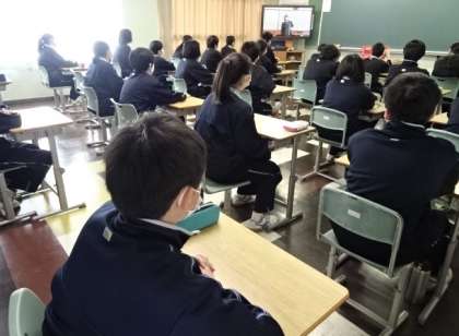 はじめに生徒会長から、先日生徒会役員が、企画・実施した「 ユニセフ募金 」への協力に対してのお礼と報告がありました。