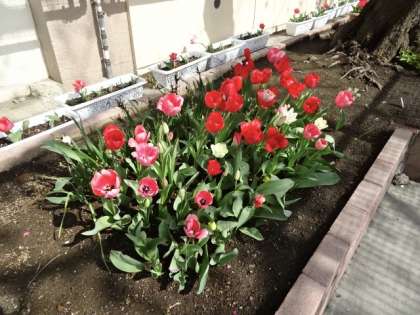 校庭の花壇には、赤いチューリップがきれいに咲きました。また、体育館に入る特別棟の入り口には、アレンジメントフラワーが並べてあります。これらは現在リノベーション工事中の飛鳥中学校の花壇からのものです。